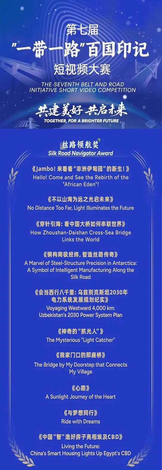 《与梦想同行》:作品记录了雅万高铁乘客的真实故事,展现出雅万高铁缩短了通勤时间,更拉近了梦想与现实,传承与未来,离别与相聚之间的距离,荣获中国外文局举办的第七届“第三只眼看中国”国际短视频大赛最佳作品奖 神马影视在线,第七届“一带一路”百国印记短视频大赛大奖“丝路领航奖”。