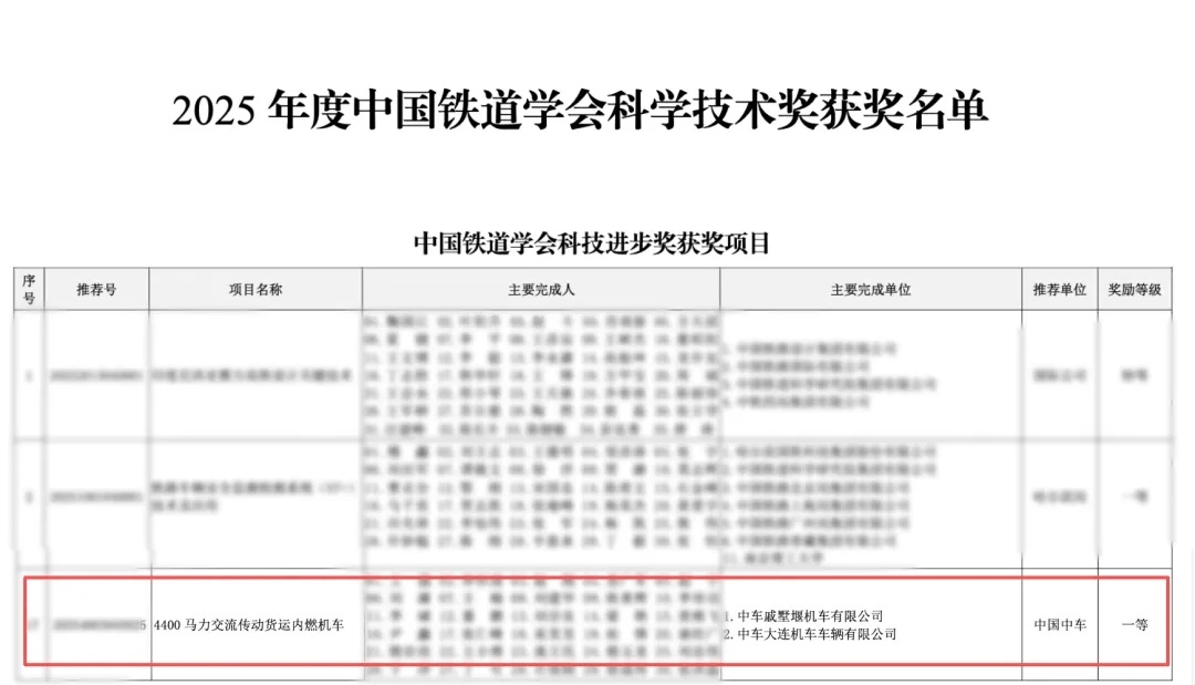 1月8日 神马影视,中国铁道学会公布2025年度中国铁道学会科学技术奖获奖名单,中车戚墅堰公司申报的《4400马力交流传动货运内燃机车》获中国铁道学会2025年度科学技术奖一等奖。