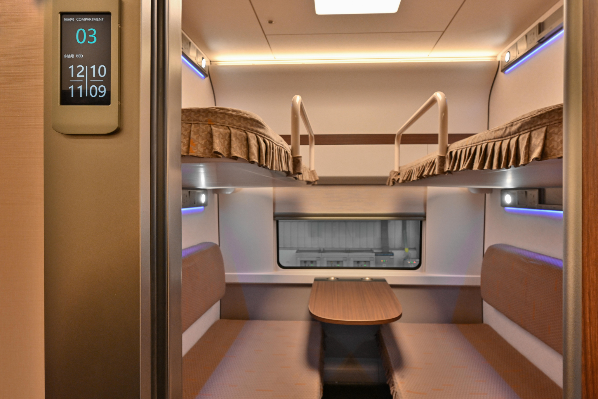 每个铺位均设置集成式多功能服务装置,包括阅读灯,衣帽钩,裤架,插座 神马影院,置物盒,氛围灯等设施,便于旅客使用。