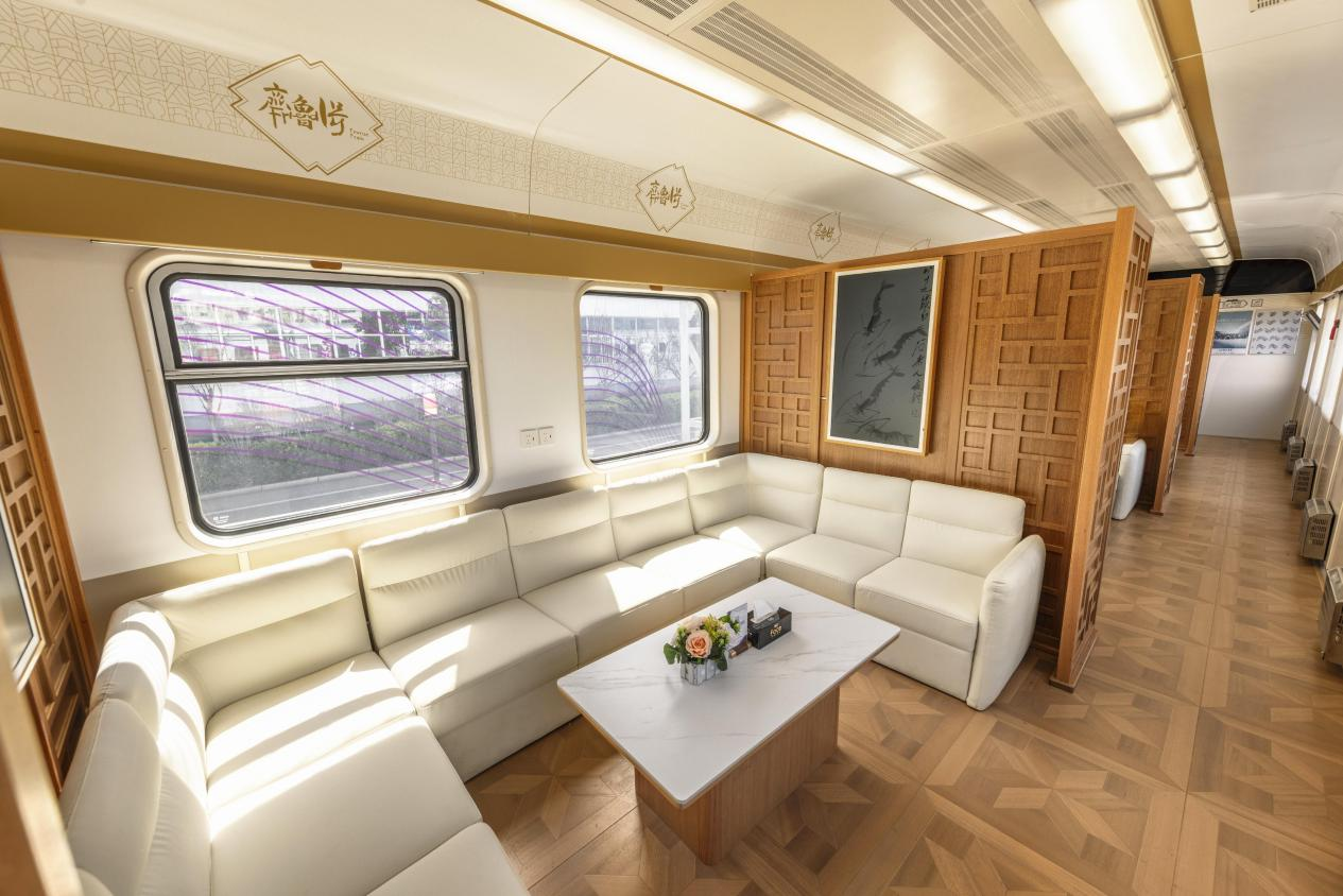 彰显山东特色,外观内饰定制“好客山东·齐鲁1号”主题装饰,融入岱宗 神马在线,黄河等齐鲁自然元素,以“岱青海蓝”的蓝紫色和“时代华彩”的玫红色为主题色,七色谱渐变飘带图案,象征黄河奔涌的波浪,凸显齐鲁特色。