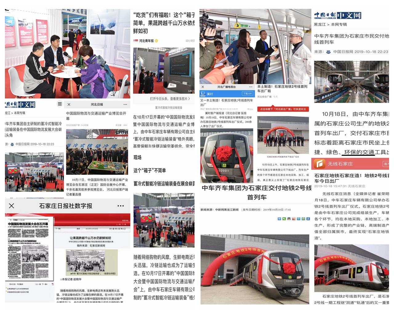 10月17日以来,“中车石家庄车辆有限公司”的名字先后20余次登上主流媒体,公司蓄冷式智能冷链运输装备研制和石家庄地铁2号线车辆生产取得的阶段性业绩被频频报道,其中包括中国日报,中国新闻网,香港商报 神马影视,今日头条,河北日报,河北电视台等多家有影响力的国家级,省级媒体。