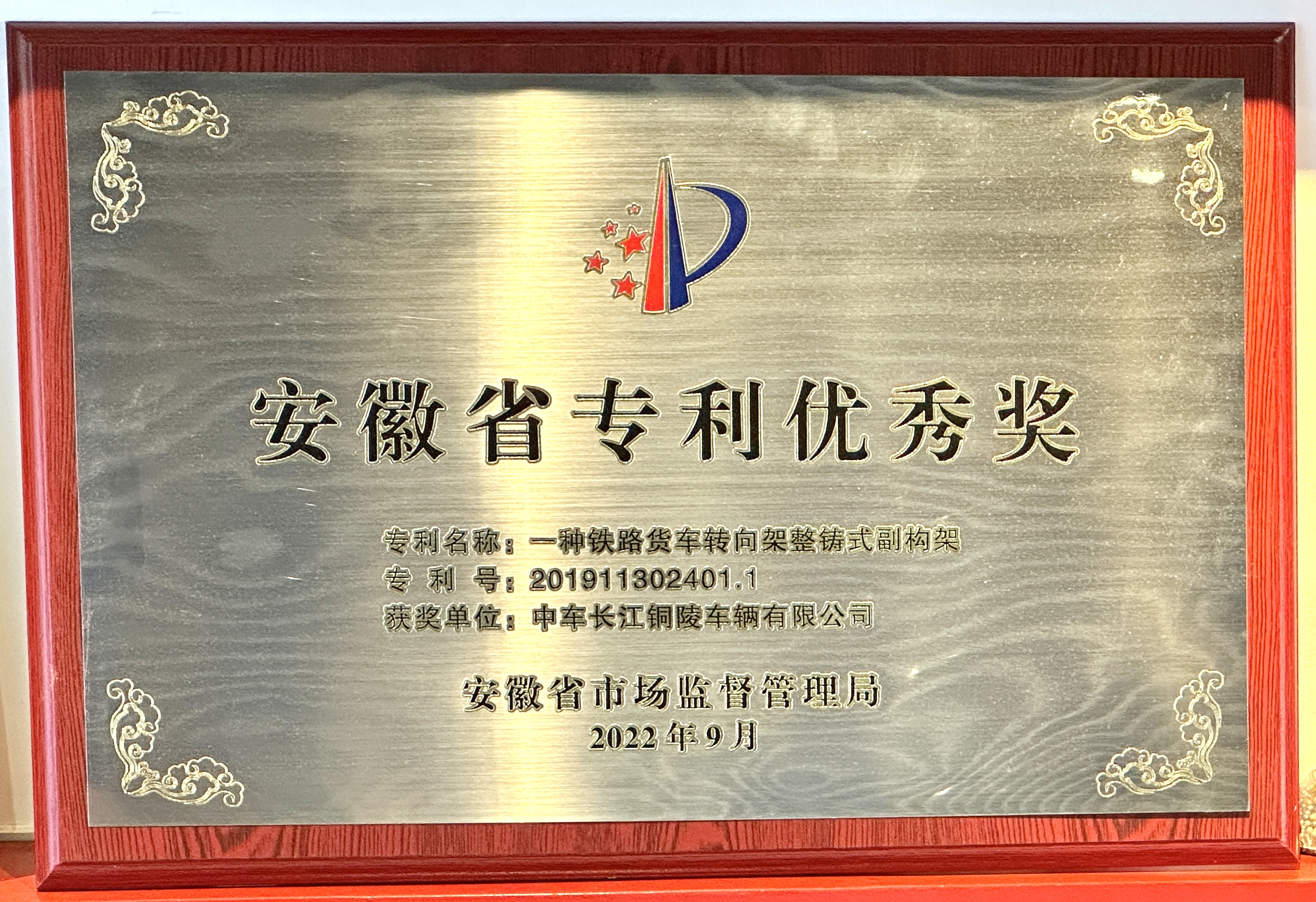 2022年公司《一种铁路货车转向架整铸式副构架》专利荣获安徽省优秀专利奖
